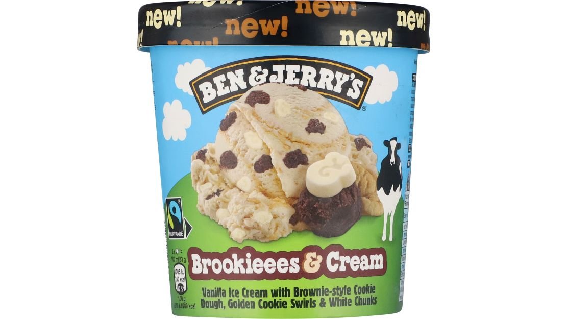 Ben & Jerry’s Brookieees & Cream er vaniljeis med brownie-cookie dough, og hvirvler af karamel, kanelkager og stykker af hvid chokolade. For dem, der elsker brookies – den lækre blanding af brownies og cookies – er dette isen, du altid har længtes efter, uden at du vidste det!