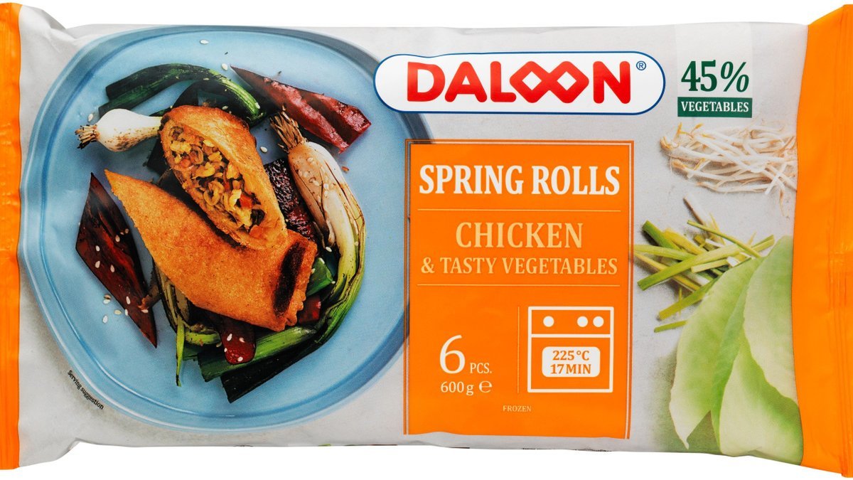 Forårsruller med kylling og grøntsager fra Daloon har knasende sprøde råvarer som hvidkål, bønnespirer, kylling porrer, gulerødder og rød peber.