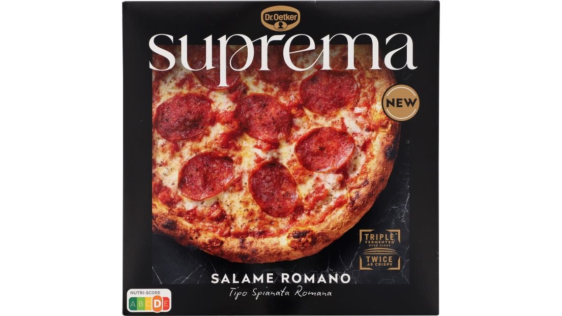 Dr. Oetker Suprema Salame Romano er en stenovnsbagt pizza toppet med skiver af salamien Spianata Romana.