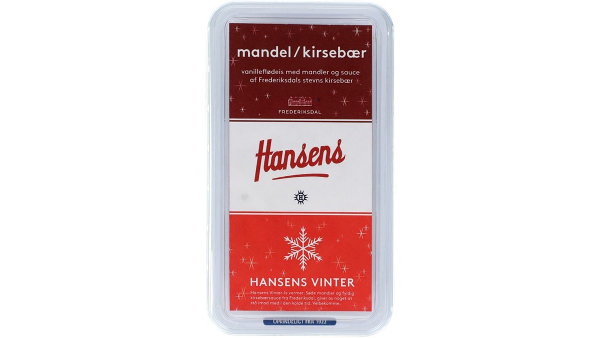 Hansens Vinteris med kirsebærsauce er en rigtig klassisker. Vi får Stevnskirsebær fra Frederiksdal. Når kirsebærene har gæret til vin er der en rest bær tilbage. Udover at vi bruger bærene til noget fornuftigt smager de helt fantastisk. En særlig krydret og fyldig kirsebærsmag. Mandlerne er de berømte Avolamandler fra Sicilien ristet og karamelliseret på traditionel vis.