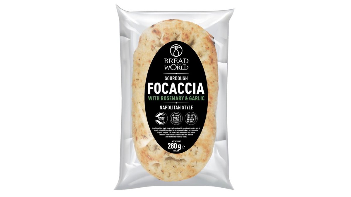 Napolitansk inspireret surdejsfocaccia med tørret rosmarin og hvidløg. Forbagt. Dybfrossen.
