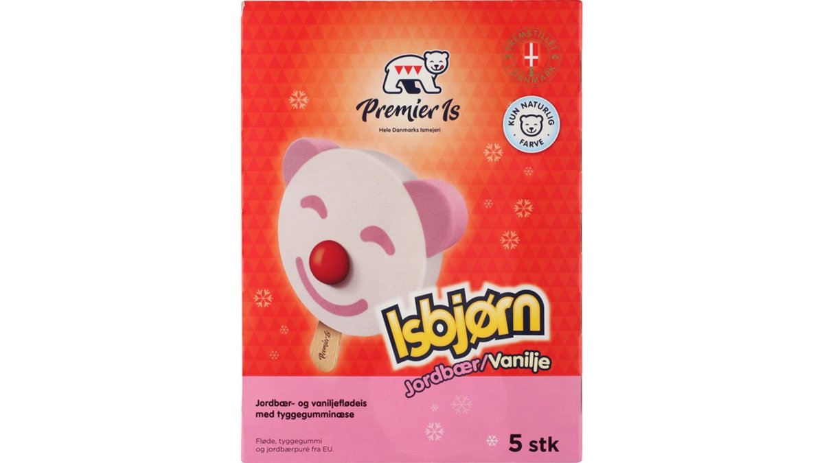 5 stk. Elsket for sin vanilje- og jordbærflødeis med tyggegummikugle-næse. Hvilken farve næse har din Isbjørn mon i dag?