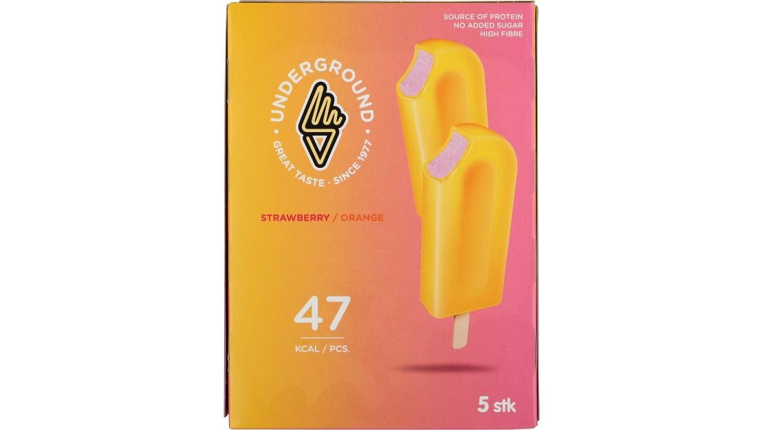 5 x 83 ml. Kun 47 kcal per ispind. Jordbærispind overtrukket med 48% appelsinlimonadeis.