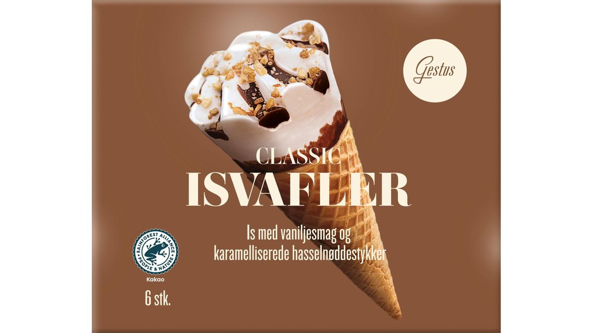 Klassiske vaffelis 6 stk. Is med vaniljesmag og karamelliserede hasselnødestykker.