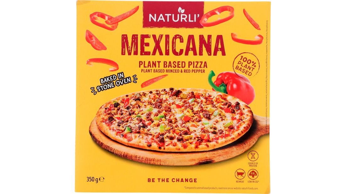 Naturli’ Pizza Mexicana. En lækker og smagfuld pizza med vego-fars, smagfulde krydderier, tomat, jalapeno og en rigtig god vego-ost.