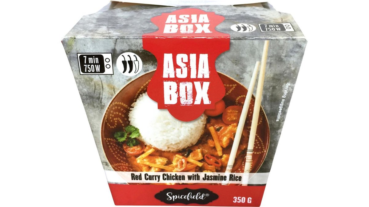 | Ingrediensliste | Ingredienser: 49% kogte jasminris (vand, jasminris, risklidolie), 22% rød karry (vand, kokosmælk, rød karrypasta (chili, hvidløg, skalotteløg, citrongræs, galangarod, kaffirlimeblade, salt, koriander, spidskommen), risklidolie, sukker, koncentrat af kokossirup, palmesukker fra kokosnød, maltodextrin, farvestoffer (E150a, E160c), konserveringsmiddel (E202)), hvidløg, skalotteløg, sød basilikum, modificeret tapiokastivelse, dextrose, gærekstrakt, 21% kogt kylling (kylling, majsstivelse (indeholder sulfit), risklidolie, salt, sukker) , bambusskud, ananasstykker, minimajs, rød chili. |