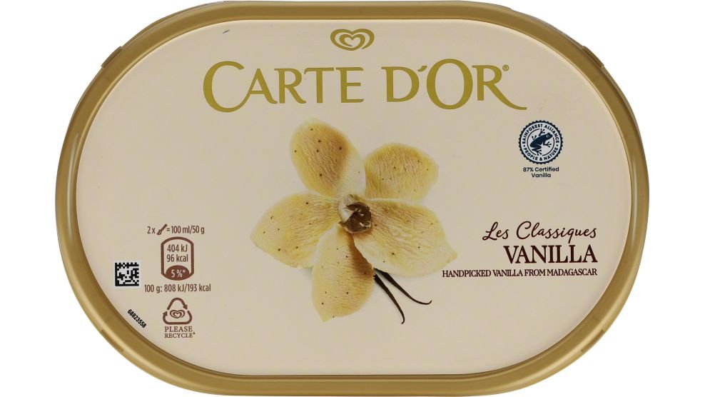 Vanilla fra Carte d’Or er en cremet vaniljeis med en dejlig smag, som er produceret med kvalitetsråvarer. Lige perfekt til desserten med fx. chokoladesauce og bær.