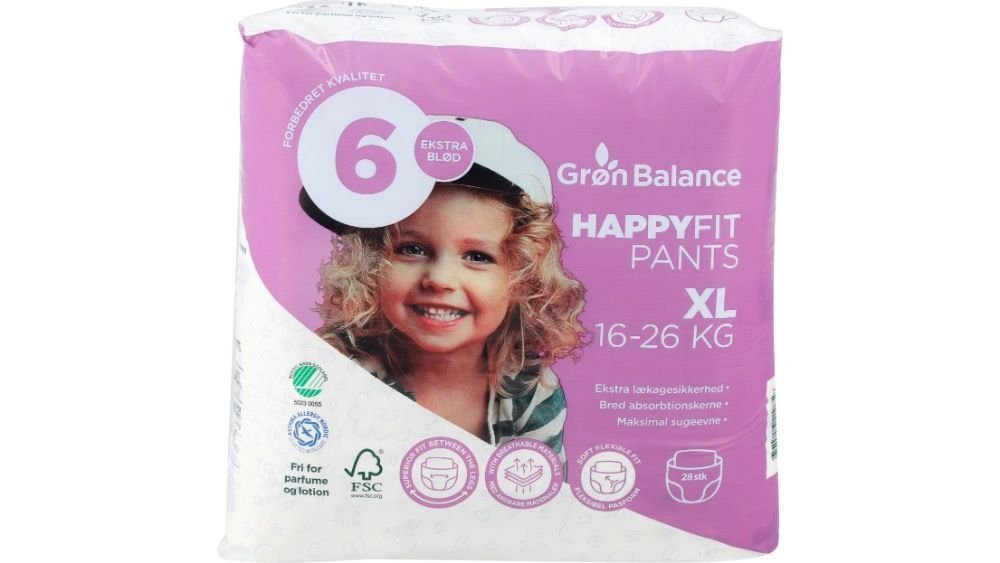 Grøn Balance bleer XL str. 6. Grøn Balance XL med er svanemærket og deklaret i samarbejde med Astma-Allergi Danmark. Bleerne er dermatologisk testet. Alligevel er det en god ide at skifte bleen hyppigt og lade barnets hud lufttørre ved bleskift – for at undgår hudirritation. Grøn Balance XL er kontrolleret af varefakta og opfylder varefaktas krav til sugeevne, overfladens tørhed og opsugningshastighed. Ingen parfume eller lotion. Grøn Balance er det naturlige valg for dig, der ønsker at spise økologiske fødevarer, værne om miljøet og undgå problematisk kemi i dine pleje- og husholdningsprodukter.