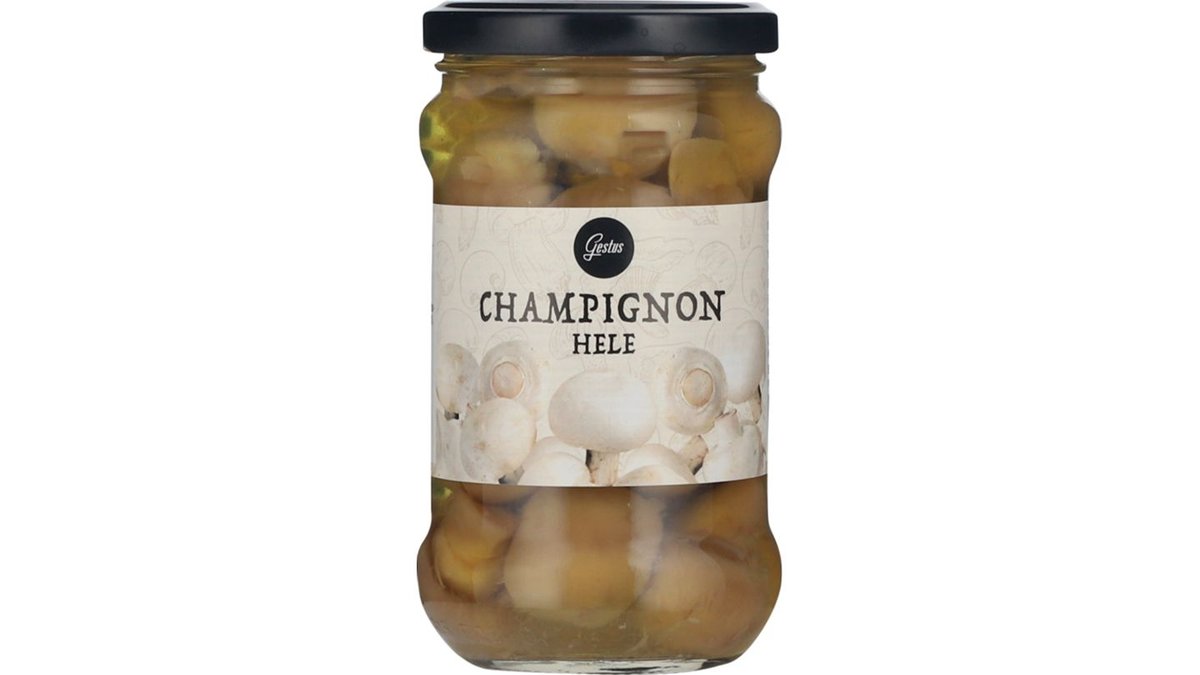 | Ingrediensliste | Ingredienser: Champignon, vand, salt, surhedsregulerende middel (E 330), antioxidant (E 300). |