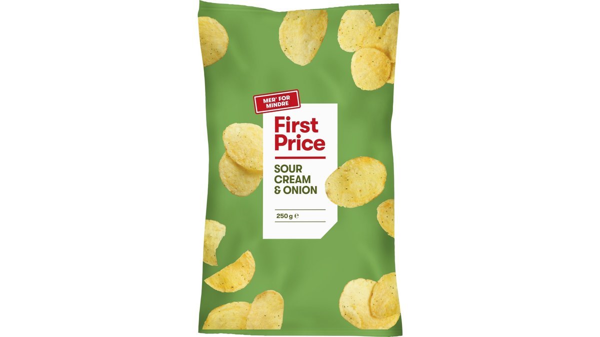 Chips med sour cream og onion fra First Price. Denne vare er en del af Wolt Market’s Discount match. Vi matcher løbende discountkæders normalpriser til vores identiske varer. Prismatch omfatter ikke tilbud, kampagner, spotpriser, udsalgspriser eller mængderabatter.