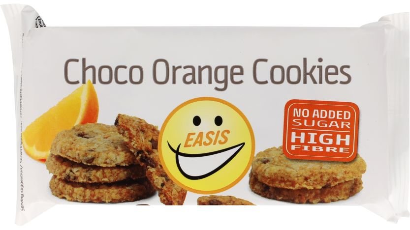 Cookies med appelsinsmag og 8,4% chokoladestykker. Indeholder sødestoffer. Uden tilsat sukker, men med et naturligt indhold af sukker.