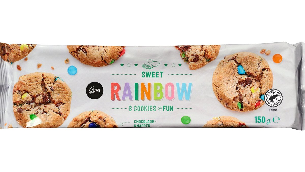 Cookies Rainbow har en sprød konsistens med lidt ekstra godt at tygge på i form af de farverige chokoladeknapper. Gestus er en serie af velsmagende madvarer af god kvalitet, som passer ind i et hverdagsbudget. Gestus brænder for at give danskerne mest muligt for pengene, både når vi taler kvalitet, pris og smagsoplevelser.