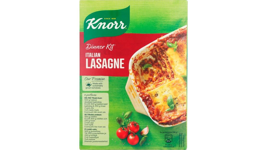 Pastapladerne i Knorr Lasagne Dinner Kit er fremstillet på traditionel vis med durumhvedemel, og sauceblandingen er krydret med en tomatpuré skabt med bæredygtigt dyrkede tomater tilsat løg, hvidløg og krydderurter.