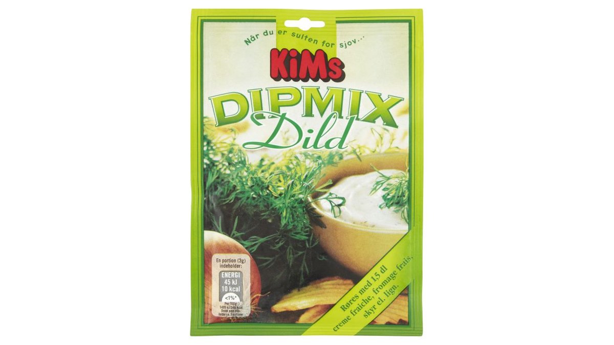 Dip mix med dild. Tilberedning: Dip mix røres med 1,5 dl creme fraiche, fromage frais, skyr eller andet syrnet mælkeprodukt. Smag dig frem og find din favorit – og du bestemmer selv, hvor fedtfattig du ønsker din dip.