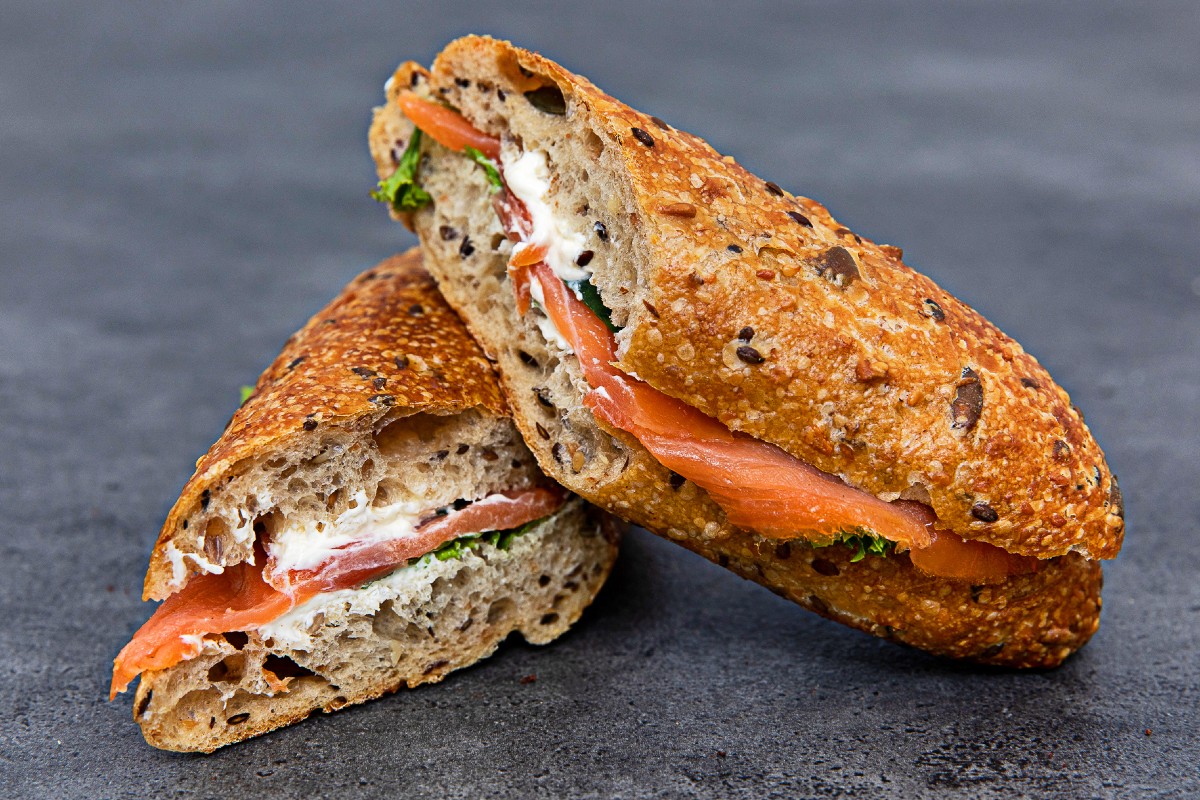 HVEDEMEL, vand, LAKS, agurker, CREME FRAICHE, icebergsalat, valsede RUGKERNER, hørfrø, SESAMFRØ, græskarkerner, solsikkekerner, salt med jod, maltekstrakt (BYG), RUGMEL, maltet HVEDEMEL, gær, HVEDEGLUTEN, skåret RUGKERNER, emulgator: (E472e, E491), RUGSIGTEMEL, antiklumpningsmiddel: E170, tørret surdej med biologiske fremstillet mælkesyre (HVEDEMEL, starter), enzymer (HVEDE), lakrids, humle, melbehandlingsmiddel: E300