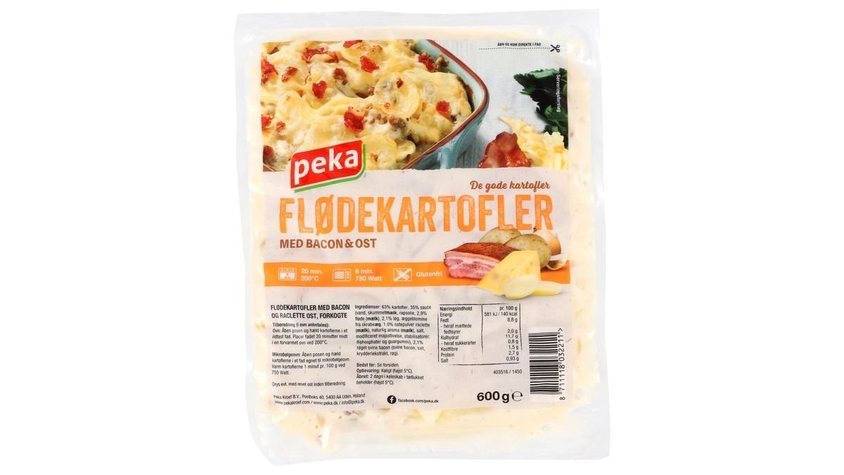 Forkogte flødekartofler med raclette ost og bacon fra Peka. Kan bruges som tilbehør til forskellige retter.
