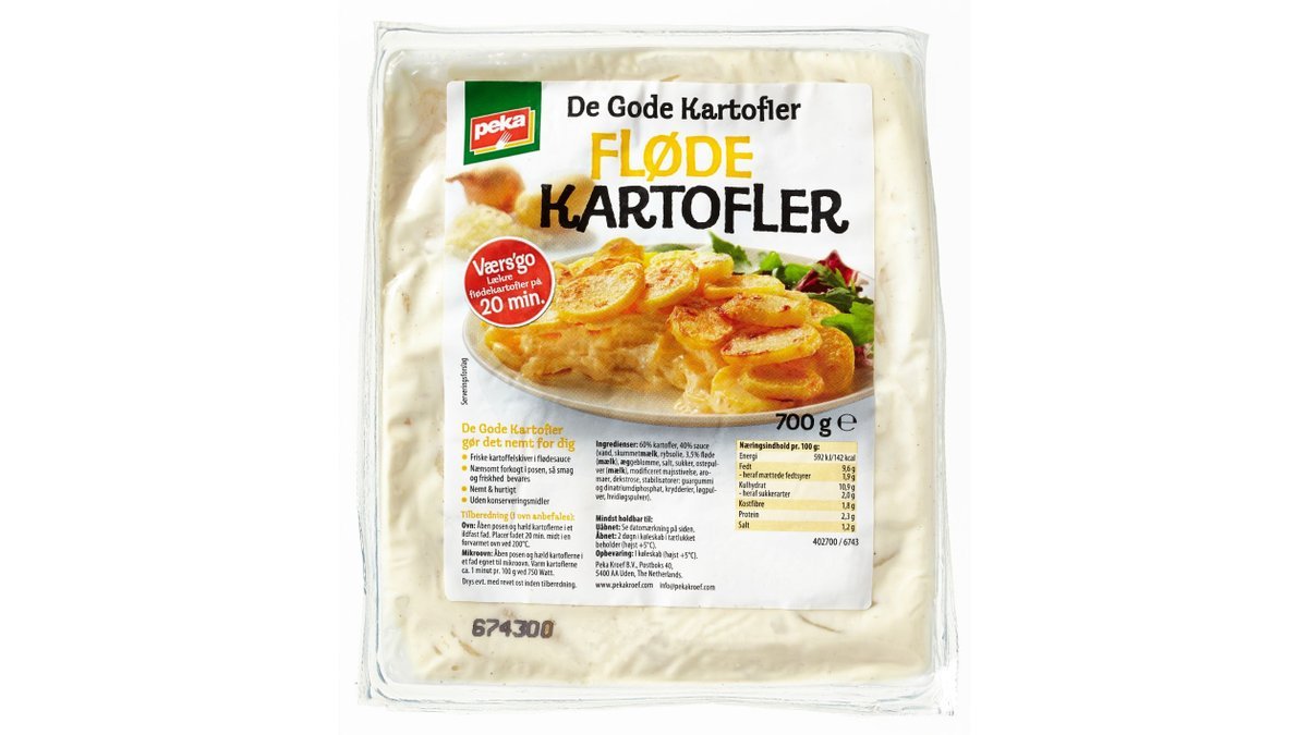 De originale flødekartofler fra Peka består af tynde kartofler i en cremet flødesovs, krydret med salt, peber og en smule revet muskatnød.