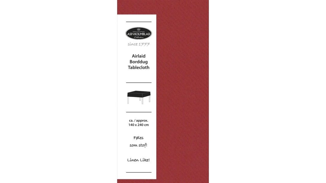 Rød dug fra ASP Holmblad, som måler 140×240 cm. Airlaid rulledug er et blødt materiale, der ikke krøller og føles som stof. Perfekt til juledekorationen.