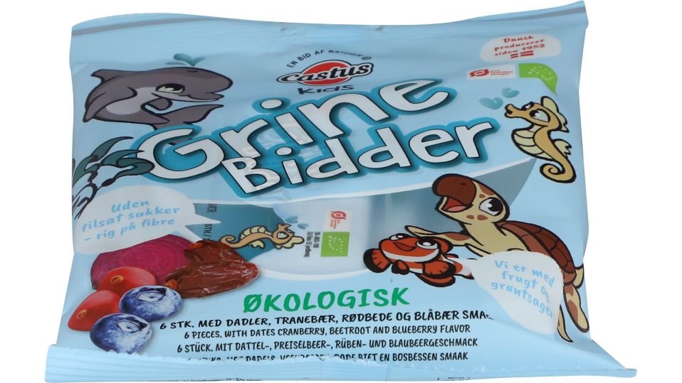 6 stk á 10 g. Grine Bidder fra Castus er en lækker frugtsnack formet som sjove figurer. De har en dejlig sød smag fra mixet af søde dadler, lækre blåbær, skønne tranebær og rødbede. De har et dejligt bid og et naturligt højt indhold af sukker fra frugt og grønt. De sødmefulde snacks passer lige madpakken eller som en dejlig snack, når du er på farten. Nyd en Grine Bidder i 10-pausen, efter træning, eller når du har lyst til lidt sødt.