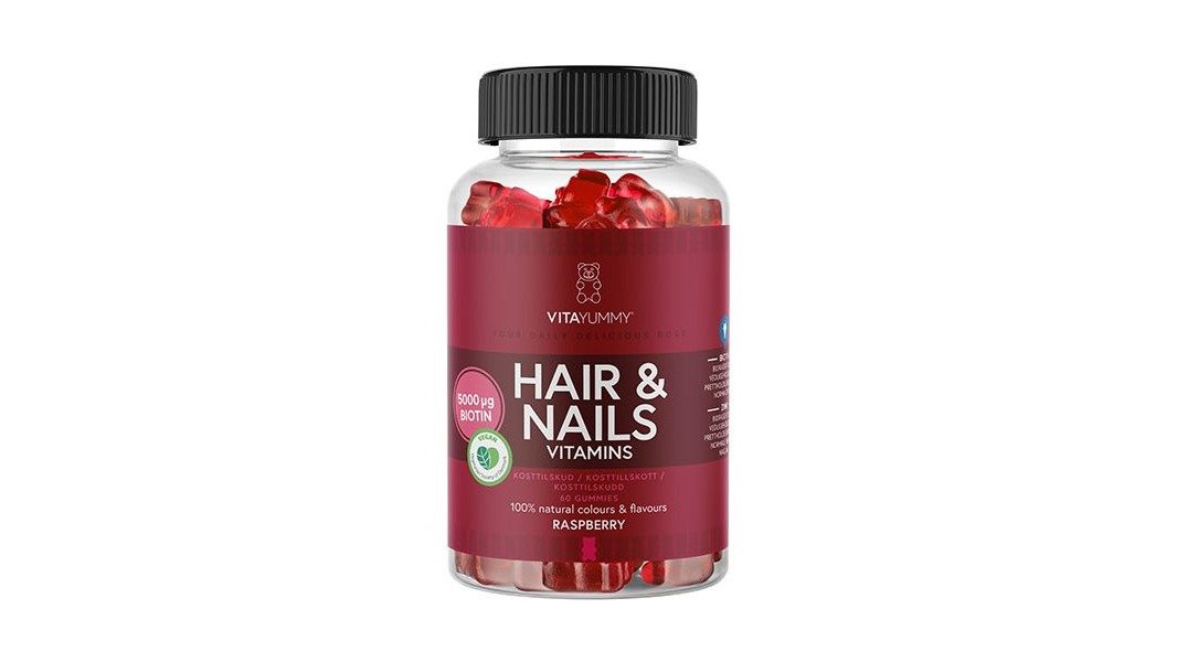 VitaYummy Hair & Nails Raspberry indeholder vitamin A, B, C, D, E og mineralerne zink, selen og jod.