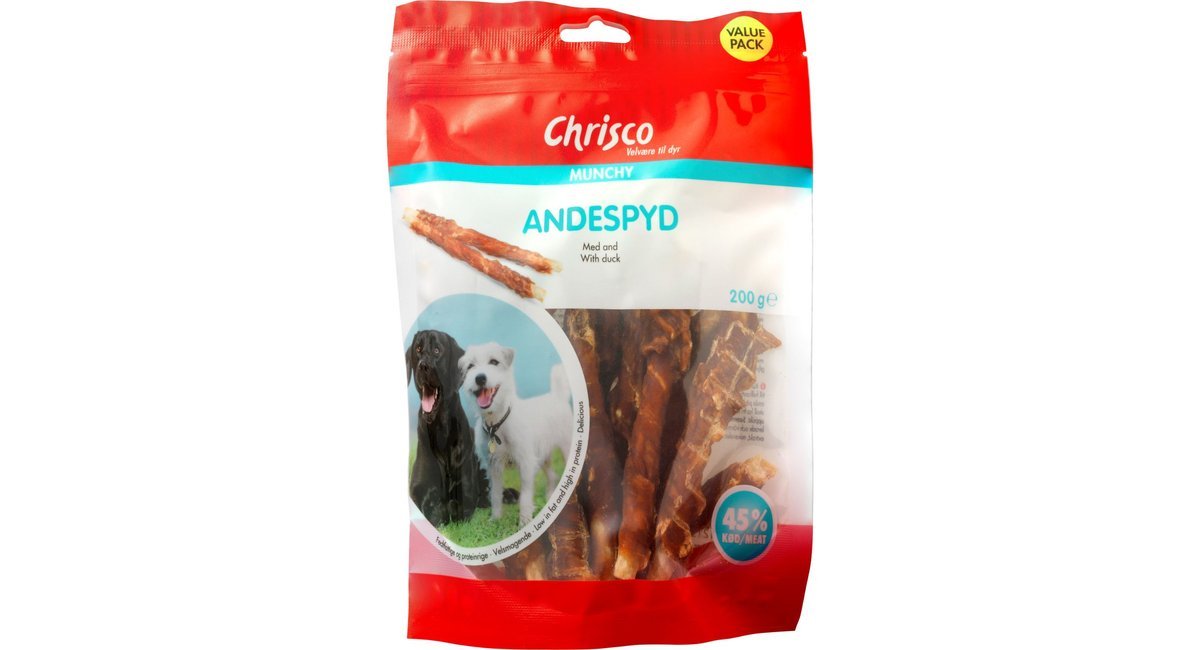 Storkøbspakke med Chrisco Andespyd, der har et kødindhold på hele 45 %. Der er tale om lækre, knasende sprøde munchy-stænger omviklet med andekød – en velsmagende, fedtfattig og proteinrig godbid, som din hund vil elske.