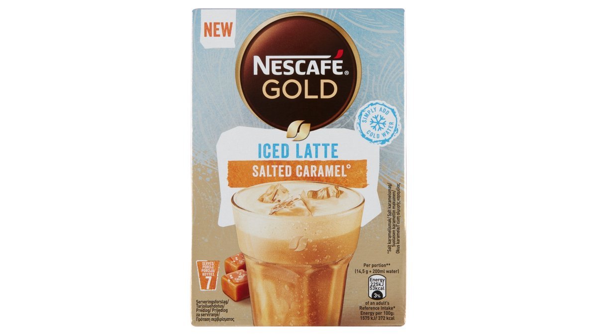 7 poser Pulver til iskaffe med salt karamel. Tilberedes med mælk.