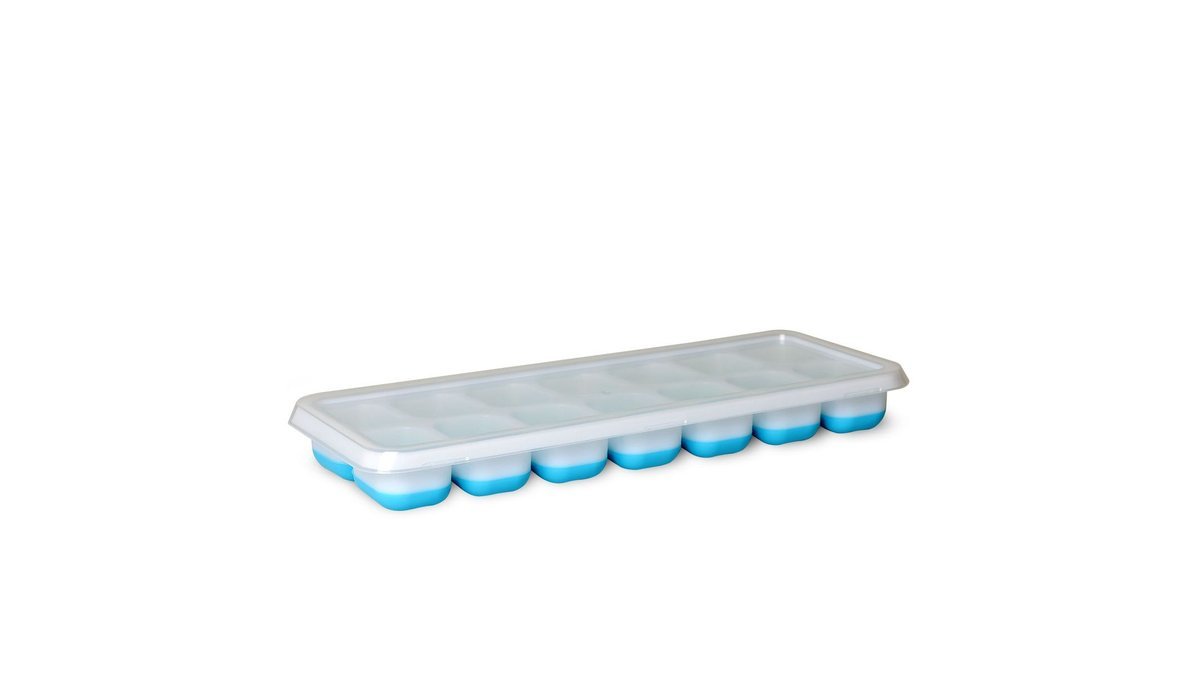 Isterningbakke med låg der beskytter isterningerne og gør at bakken kan stables. Den bløde gummibund gør det let at få isterningerne ud af formen.