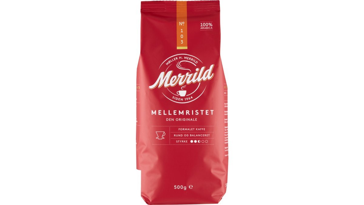 Merrild Mellemristet No. 103 er en rund og fyldig filterkaffe af mellemristede Arabica-bønner, som gør kaffen perfekt afbalanceret. Kaffen er et blend af 70% naturlig Arabica fra Sydamerika og 30% vaskede, håndplukkede Arabica-bønner.