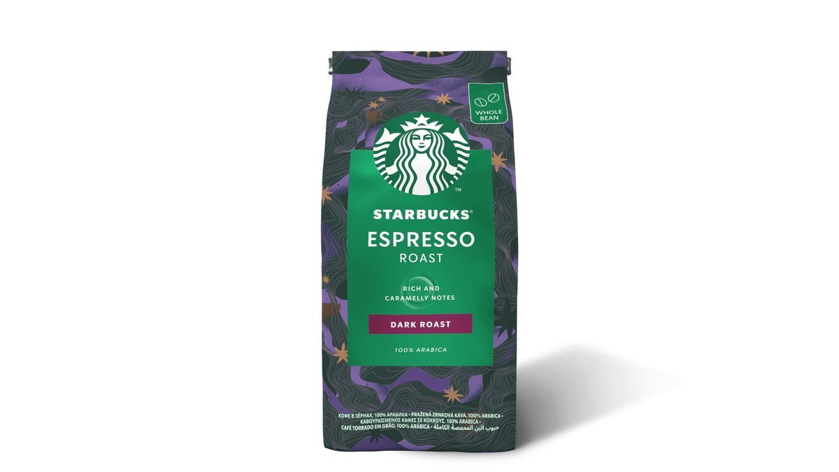 Hele mørkristede kaffebønner med en fyldig og karamelliseret smag. Starbucks Espresso Roast byder med sin perfekte blanding af den bedste kaffe fra Latinamerika og Asien/Stillehavsområdet på en intens og karamelagtig sødme. 0UD