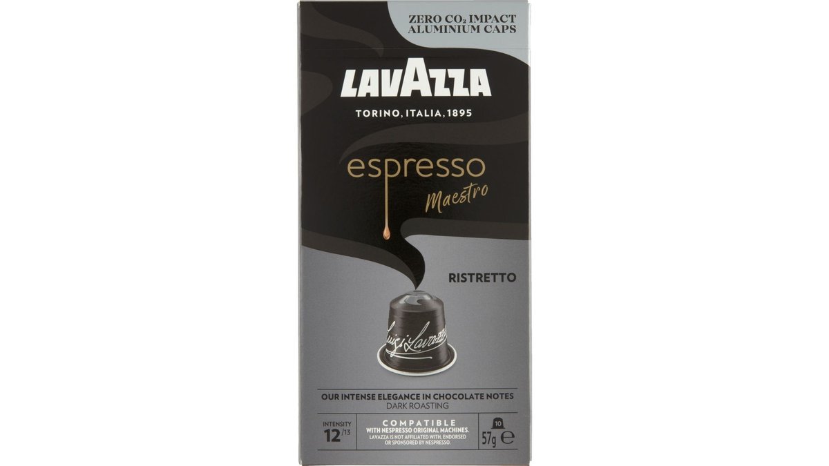 Lavazza Espresso Mastro Risretto kaffekapsler, der er velegnet til Nespresso Original-kaffemaskiner. Kaffen i kapslerne er lavet på en blanding af Arabica- og Robusta bønner. Kaffen er kraftig og intens med chokolade og karamel noter.