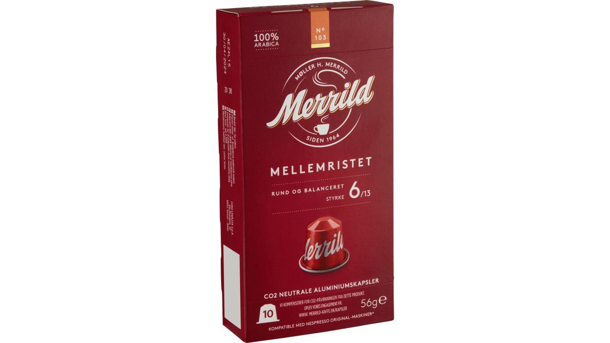 Merrild mellemristet. Danskernes foretrukne kaffesmag nu i kapsel til din nespressomaskine. Pakken indeholder 10 co2 neutrale kapsler. En rund og afbalanceret smag med medium styrke 6.