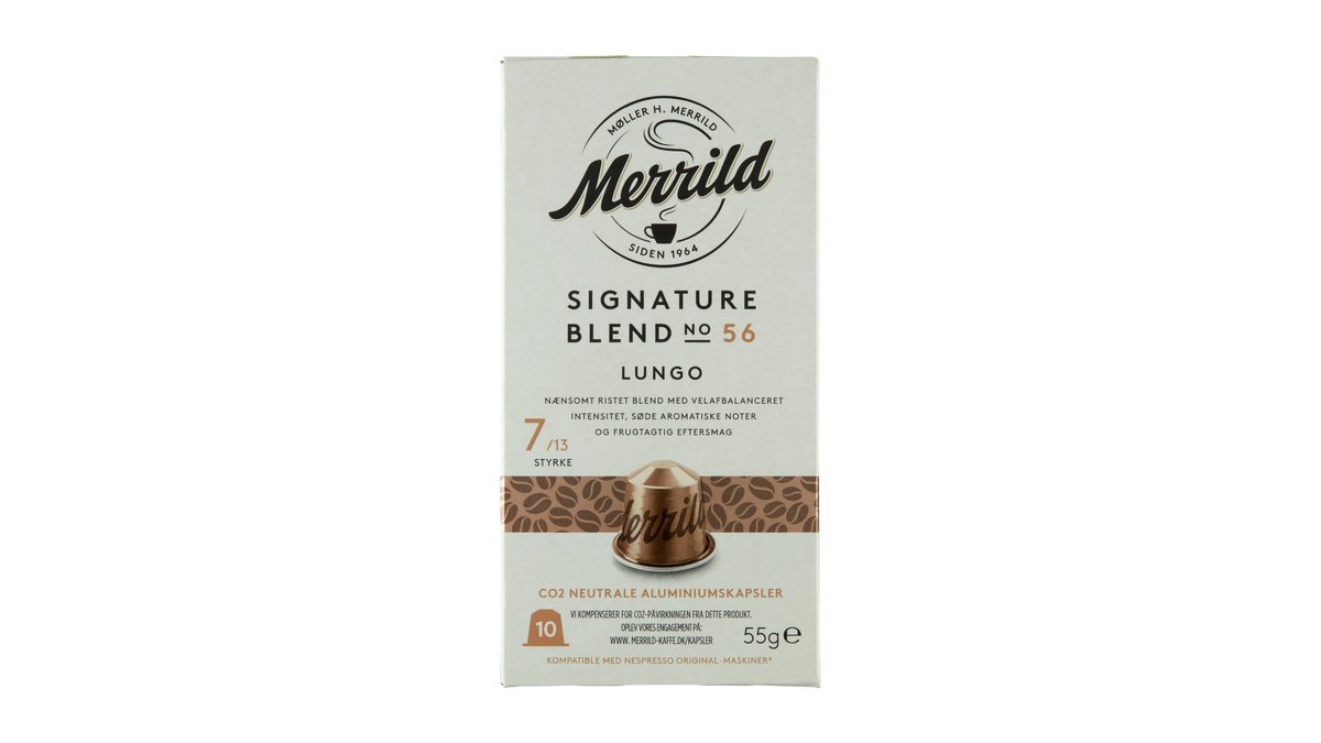 Merrild signature blend er en mellemstærk kaffe af styrke 7. Danskernes foretrukne kaffesmag i kapsel til din nespressomaskine. pakken indeholder 10 co2 neutrale kapsler.