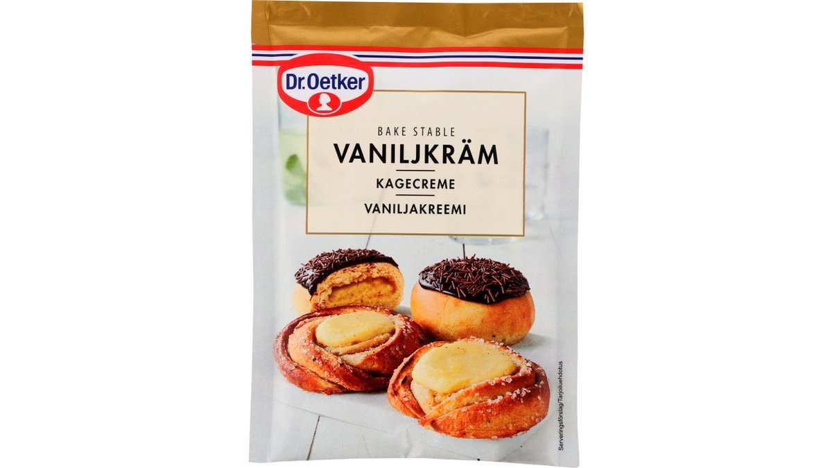 Dr. Oetker Bagestabil Kagecreme er en lækker kagecreme med Bourbon vanilje. Kagecremen er nem og hurtig at tilberede, og kan bruges i både lagkager og som bagestabil kagecreme i fx fastelavnsboller, linser og tærter. Fastelavnsboller med Dr. Oetker Bagestabil Kagecreme kan fryses.Hvis man ønsker at undgå laktose, kan letmælken erstattes med laktosefri mælk.Hvis man helt ønsker at undgå mælk, kan letmælken erstattes med mandeldrik