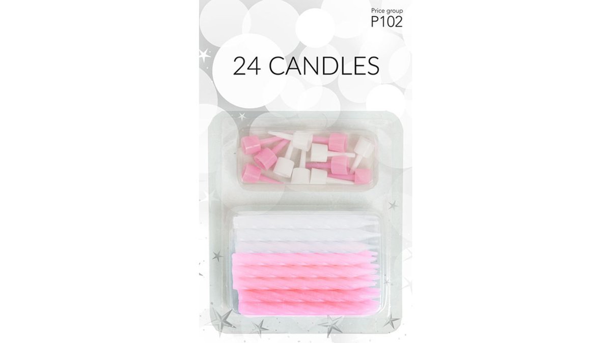 Kagelys i farverne hvid og rosa samt 12 stk. holdere til lysene i de samme farver. Lysene kan bruges på lagkagen til din og dine børns kommende fødselsdage eller til andre fejringer.