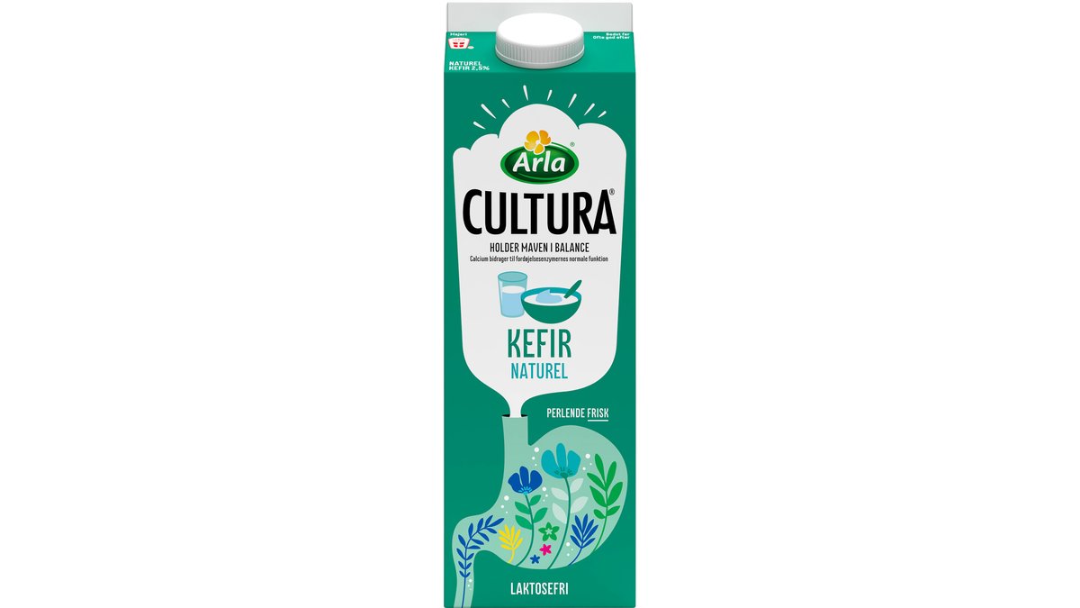 Arla Cultura ® Kefir er fermenteret med kefirkultur, som stammer forskellige mælkesyrebakterier og gær. Det giver en perlende frisk mælk med en karakteristisk duft og en let syrlig smag. Kefiren er kilde til calcium og protein. Kefir kan drikkes som den er, eller nydes med havregryn, mysli eller friske bær. Den smager også godt til varm, krydret mad og grillet kød. Prøv også vores Arla Cultura® Kefir Blåbær eller Vaniljesmag – alle varianterne er laktosefrie. Arla Cultura® Holder maven i balance* *Calcium bidrager til fordøjelsesenzymernes normale funktion. Som en del af en sund, varieret kost og en aktiv livsstil.