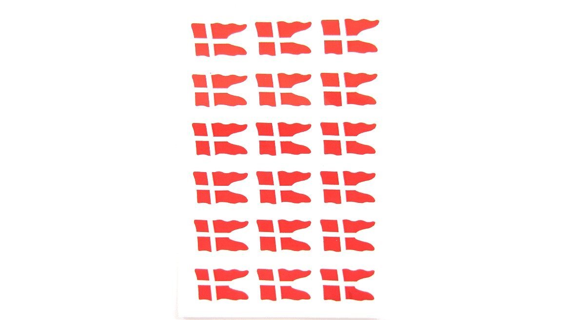 Mellemstore klistermærker / stickers med danske flag til fødselsdag og pynt. 2 ark a 18 stk. = 36 klistermærker.