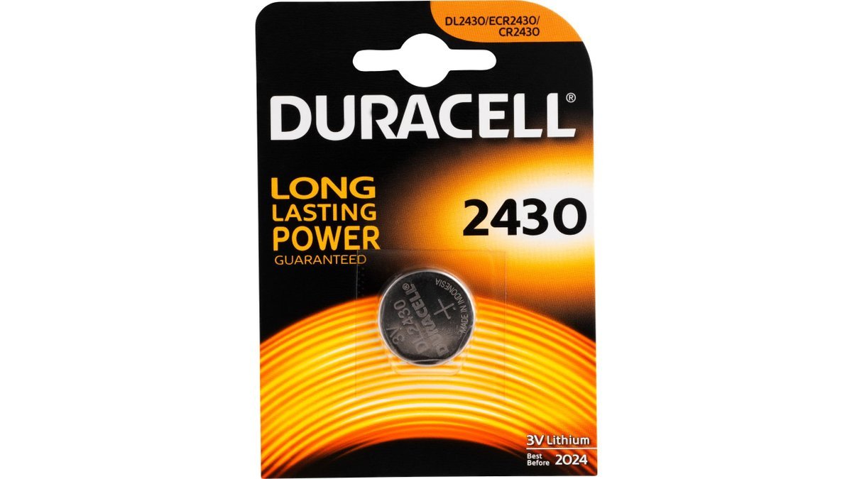 Duracell knapcellebatteri af typen DL/CR2430. Batteriet er et Lithium batteri med ekstra lang levetid.