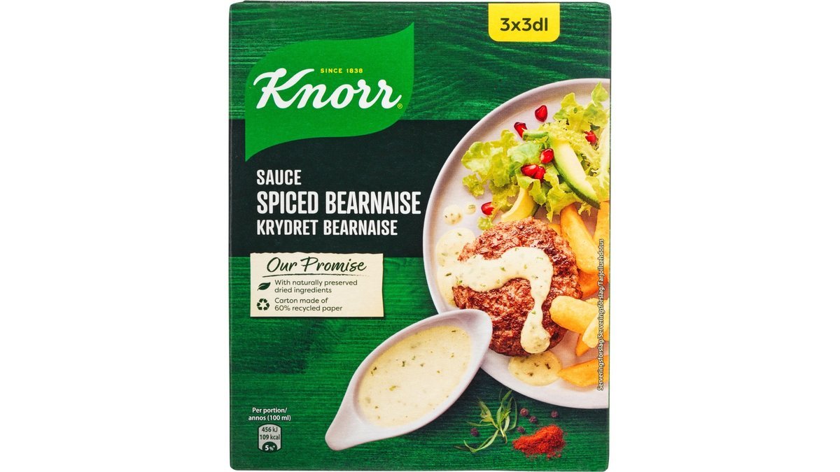 Krydret Bearnaise Sauce indeholder 3 breve, der hver svarer til 3 dl færdiglavet sauce, som naturligvis er er helt uden konserveringsmidler, smagsforstærkere og tilsatte farvestoffer.