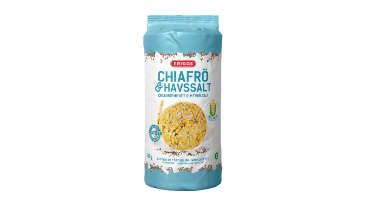 FRIGGS Majskager Chiafrø & Havsalt er lavet af majs, chiafrø og lidt havsalt. Indeholder fuldkorn og er rige på fiber.