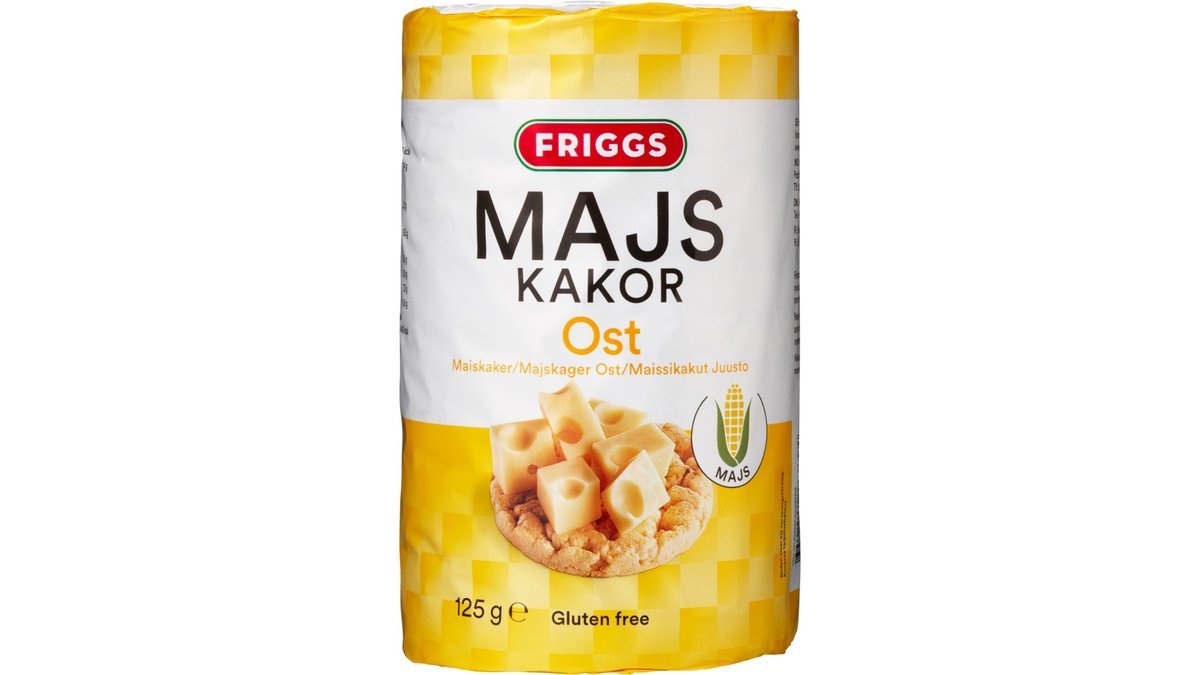 Friggs Majskager med ost er sprøde majskiks med en god smag af ost. Velegnet til mellemmåltid eller snacks uanset hvor du er. Majskagerne med ostesmag kan spises som de er eller toppes med dine favoritter, f.eks. flødeost og friske grøntsager. Majs er naturligt fri for gluten.