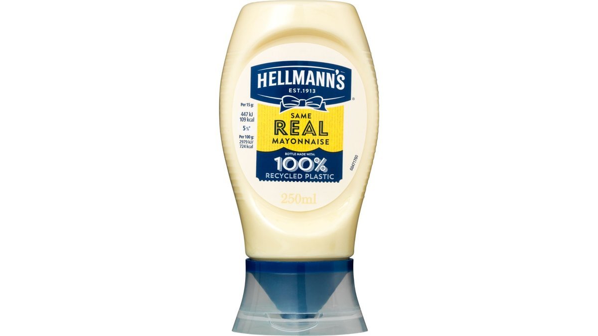 Hemmeligheden bag den cremede og lækre smag af Hellmann’s Real Mayonnaise er naturlige og enkle ingredienser som olie fra bæredygtige kilder og æg fra fritgående høns. Denne praktiske flaske er nu fremstillet af 100 % genbrugsplast for ægte smag og mindre plastikaffald.