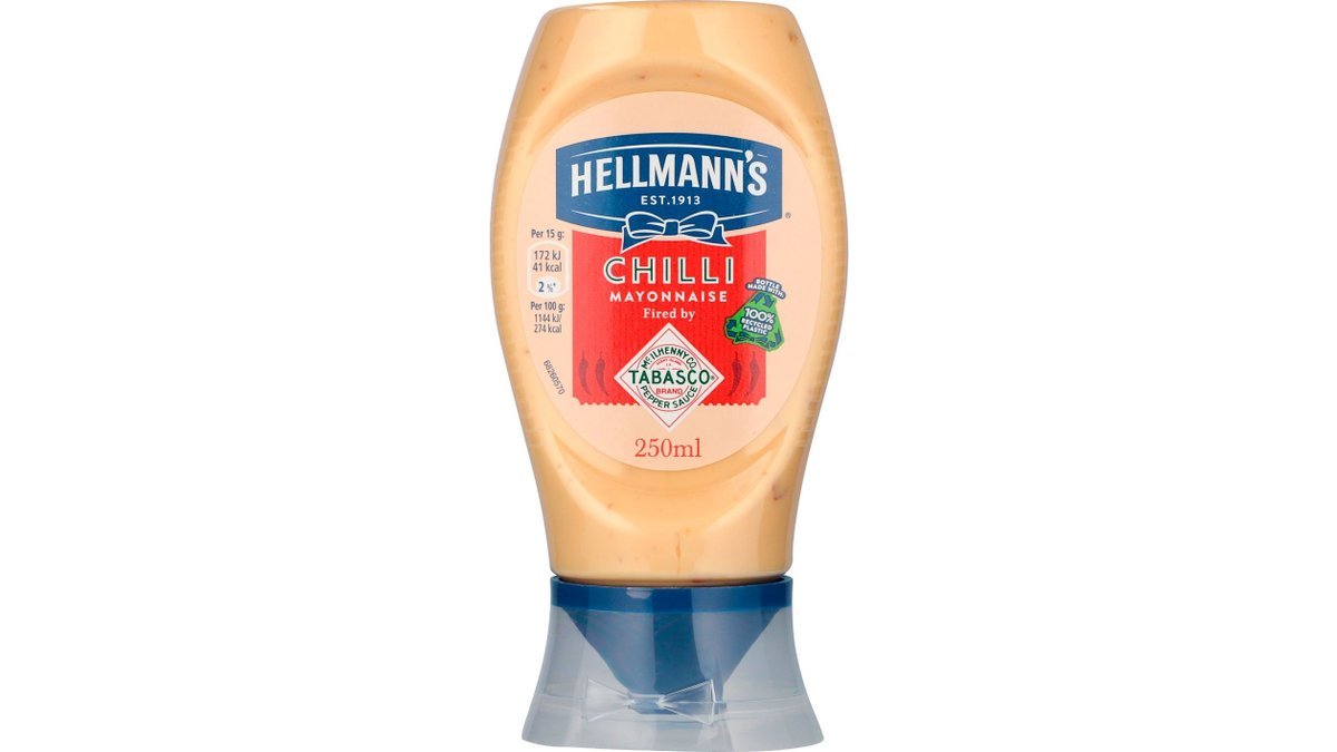 Hellmann’s chilimayonnaise er lavet på naturlige ingredienser og æg fra fritgående høns. Mayonnaisen giver det ekstra lille kick, som tilbehør, i en sauce eller direkte i burgeren. Nu i en flaske af 100% genanvendt plast.