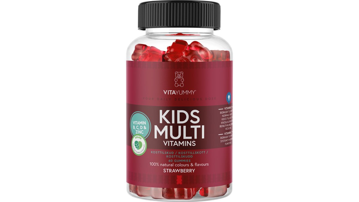 VitaYummy Kids Multivitamins er til børn fra 3-11 år. Skønne multivitaminer til børn, der smager af søde jordbær.