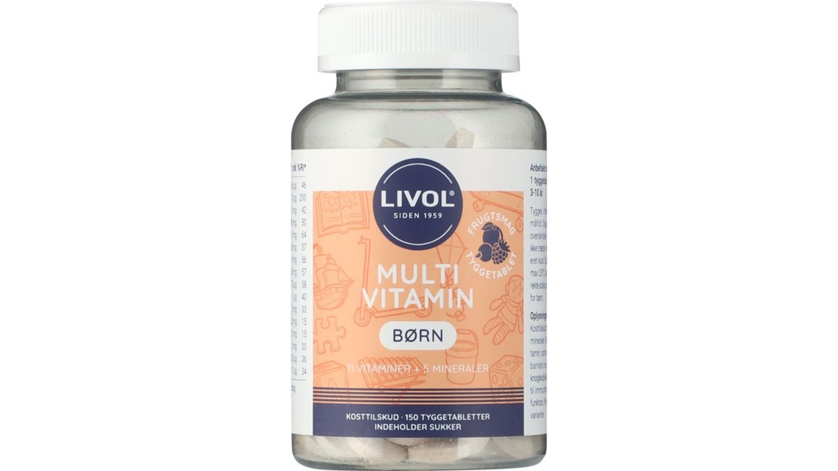 Livol Multivitamin til børn med frugtsmag, dækker dit barns daglige vitamin- og mineralbehov. Tyggetabletten har en sød, børnevenlig smag af frugt, som de fleste vil kunne lide, og er let for barnet at tygge. Multitabletten, der er tilpasset barnets særlige behov, indeholder bl.a. D vitamin, som er nødvendigt for barnets normale vækst og knogleudvikling samt bidrager til immunforsvarets normale funktion. Derudover indeholder tabletten alle 7 B-vitaminer, C-, D- og E vitamin og jern, der bidrager til en normal kognitiv udvikling hos børn. Livol Multivitamin Børn frugt indeholder sukker.