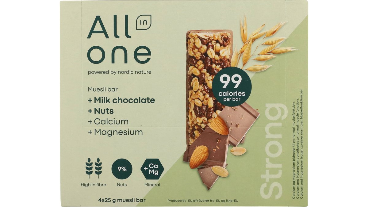4 x 25 g. All in one Müslibar Strong med nødder og mælkechokolade har et naturligt indhold af magnesium og er tilsat calcium. Calcium og Magnesium bidrager til en normal muskelfunktion. En müslibar indeholder under 100 kalorier og er rig på fibre og mineraler og er helt uden palmeolie. Nyd den som en snack, et mellemmåltid eller tag den med til træning.
