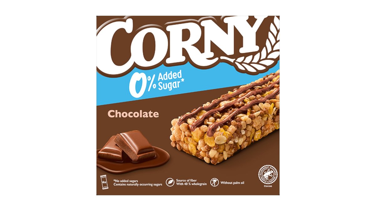 Ingen skal gå ned på snacks. Heller ikke selvom man ønsker at undgå rafineret sukker. Derfor har vi lavet Corny 0% Added Sugar* Chocolate med 33% fuldkorn og ingen tilsat sukker*. Corny 0% Added Sugar* Chocolate er det bevidste valg med samme gode Corny smag som altid, og med kun 68 kcal pr bar. Corny 0% Added Sugar* Chocolate kommer i smart multipakæske med 6 barer i. Perfekt til madpakken, kontorskuffen eller tasken.