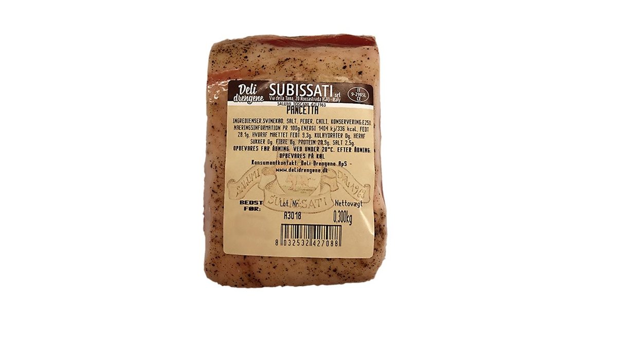 Lækker italiensk pancetta, italienernes bacon. Perfekt til at bruge i carbonara, eller på et tapasbord. God markant krydret smag, smager så fuglene synger. Anbefalet af Deli Drengene.