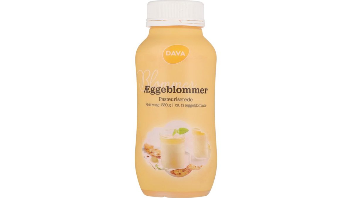 | Ingrediensliste | Ingredienser: Pasteuriserede ÆGGEBLOMMER af skrabeæg, konserveringsmiddel (E202), surhedsregulerende middel (E330). |
