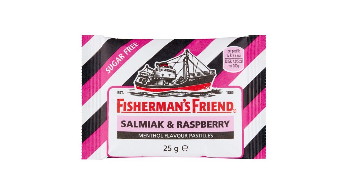 En pastil med den kendte Fisherman’s Friend salmiak og et strejf af søde hindbær.