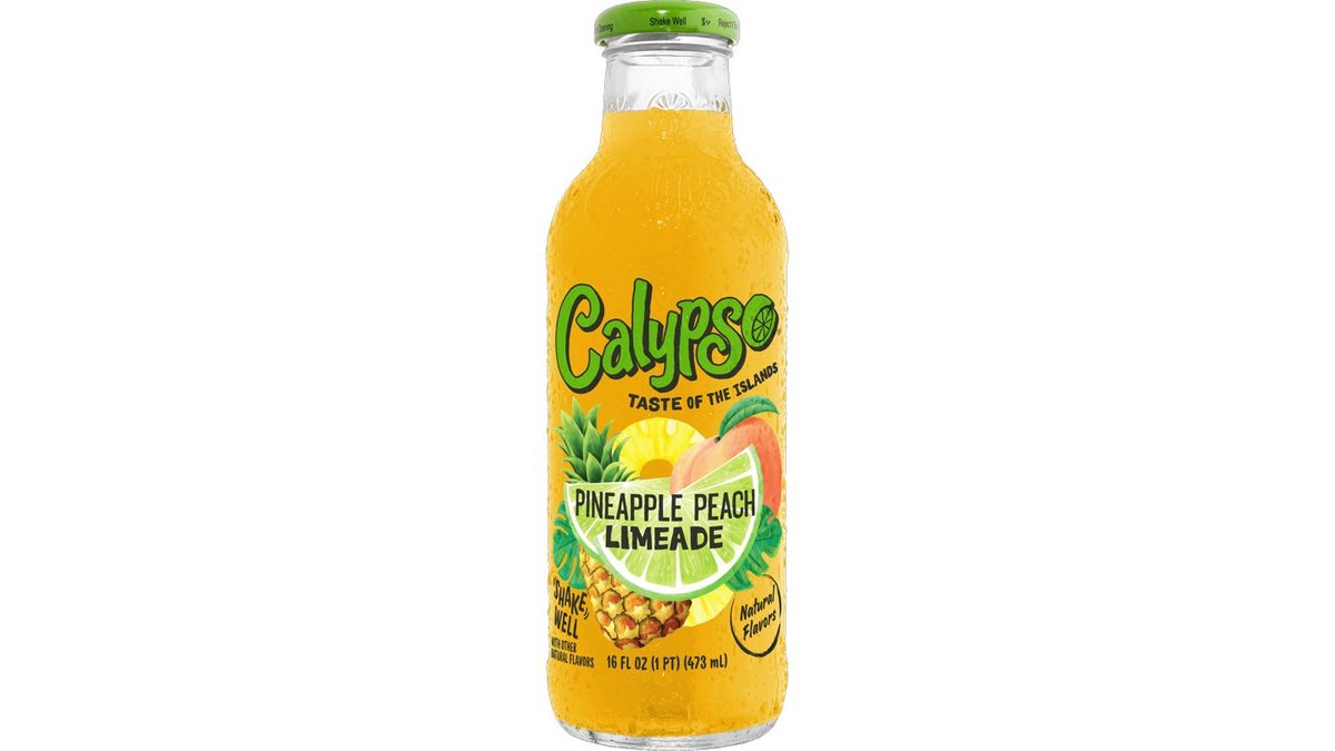 Calypso Limeade Pineapple Peach er en lemonade lavet på lime, naturlig smag og med rigtige stykker frugtkød fra limen. Denne version er med smag af ananas og fersken.